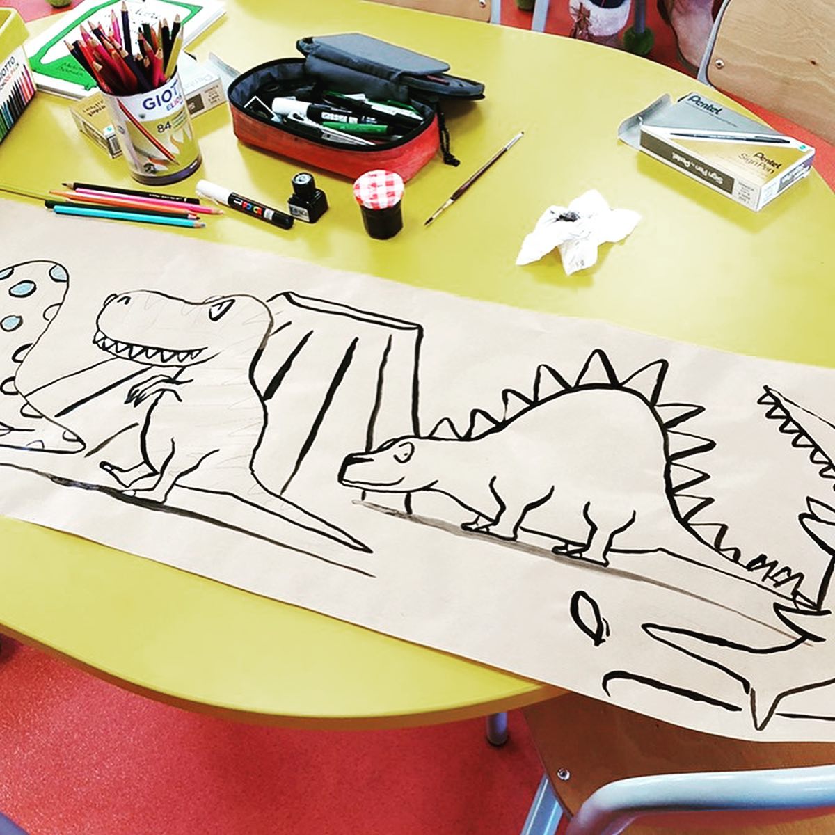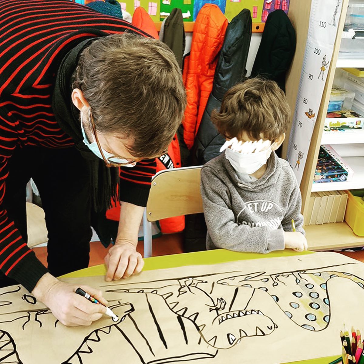 Je peux aussi faire une fresque avec les enfants : je dessine sur une longue feuille de craft (3m) au pinceau et à l’encre de chine, ce qui me permet d’expliquer en même temps aux enfants comment on construit un dessin et parler du dessin qui est en train de se faire.
