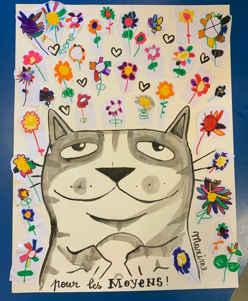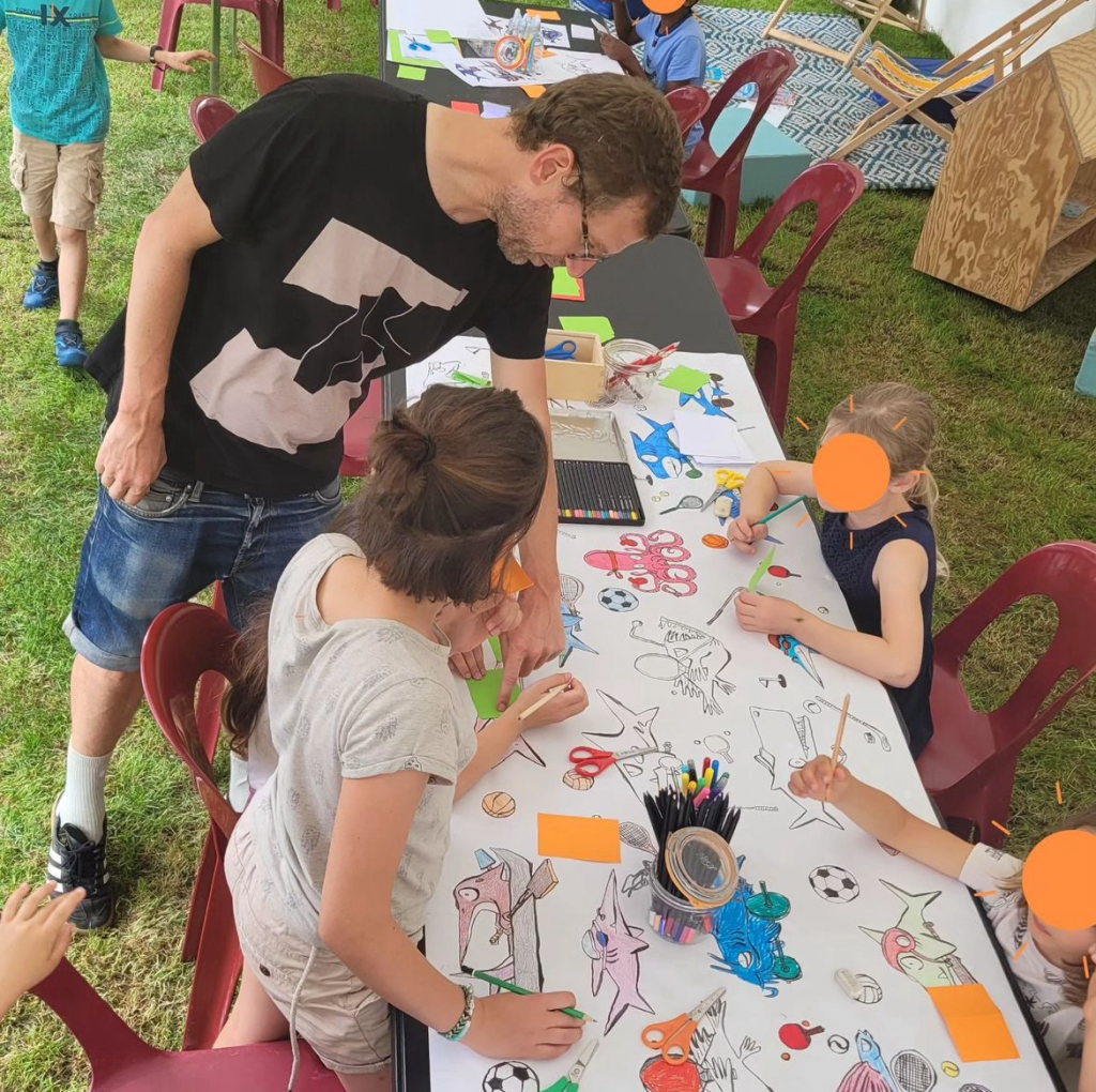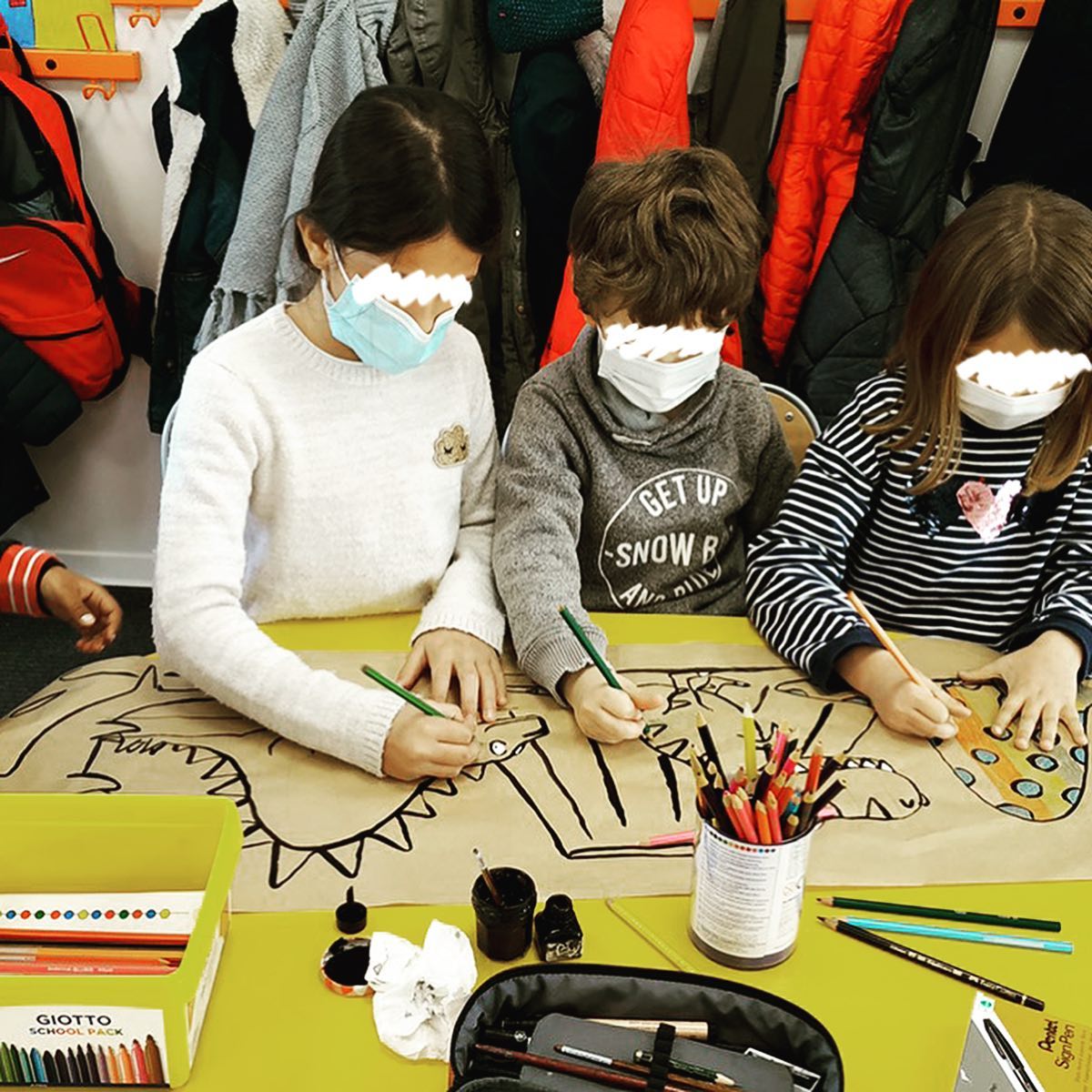 Enfin, pour les rencontres plus longues, si nous avons le temps, nous pouvons faire (ou entamer) un petit atelier de dessin ou d’écriture pour que les enfants puissent garder une trace de nos échanges. (voir onglet « Atelier ») que je peux adapter au niveau et à la classe en question (ci-dessous un dessin participatif avec les maternelles).