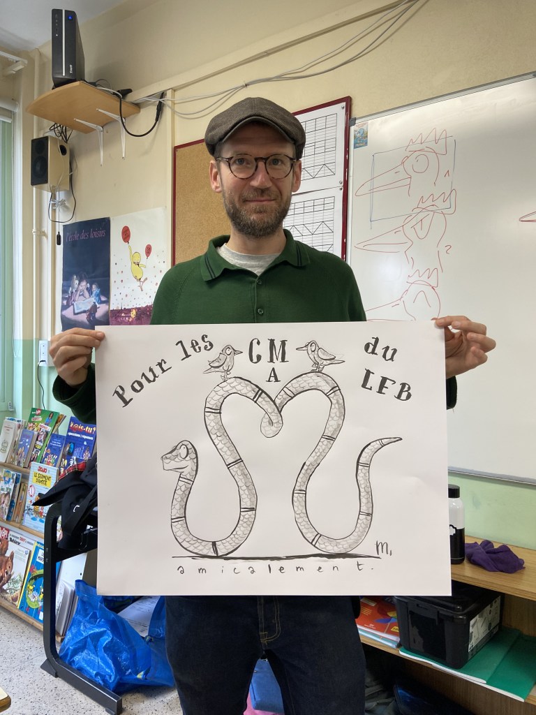 Pour le déroulement des rencontres, grosso modo, j’ai pour habitude de présenter mes livres (ou plus précisément un livre que vous avez travaillé en particulier) et de répondre d’abord aux questions des enfants (sur les livres, le dessin ou l’écriture). Je leur parle de la chaîne du livre et de notre travail en général, c’est souvent des discussions très enrichissantes pour tout le monde (car le dessous de notre travail est peu connu).